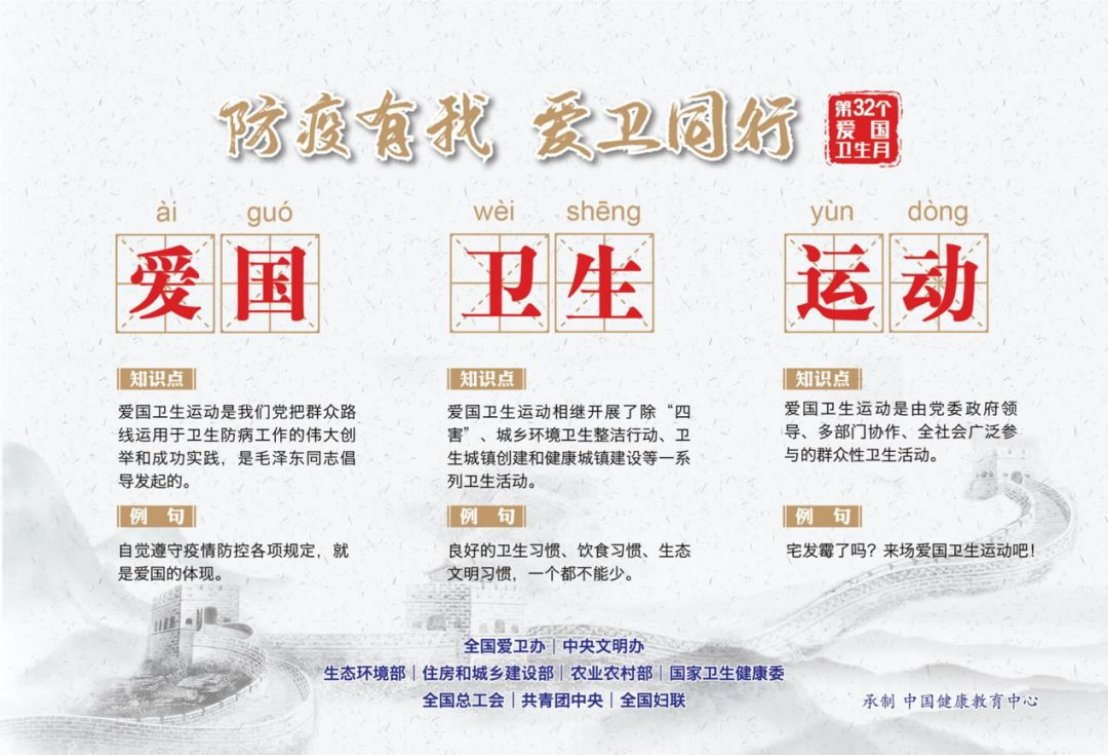 愛(ài)國是核心、衛生是根本、運動(dòng)是方式,愛(ài)國衛生人人受益,疫情防控人人有責。在以習近平同志為核心的黨中央堅強領(lǐng)導下,全國人民同舟共濟、眾志成城,新冠肺炎疫情防控取得顯著(zhù)成效。道阻且長(cháng),行則將至。4月是第32個(gè)愛(ài)國衛生月。為深入貫徹落實(shí)習近平總書(shū)記系列重要講話(huà)精神,大力開(kāi)展愛(ài)國衛生運動(dòng),強化預防優(yōu)先,打造健康環(huán)境,為全面打贏(yíng)新冠肺炎疫情狙擊戰奠定堅實(shí)基礎,為鞏固疫情防控成果繼續貢獻自己的力量。