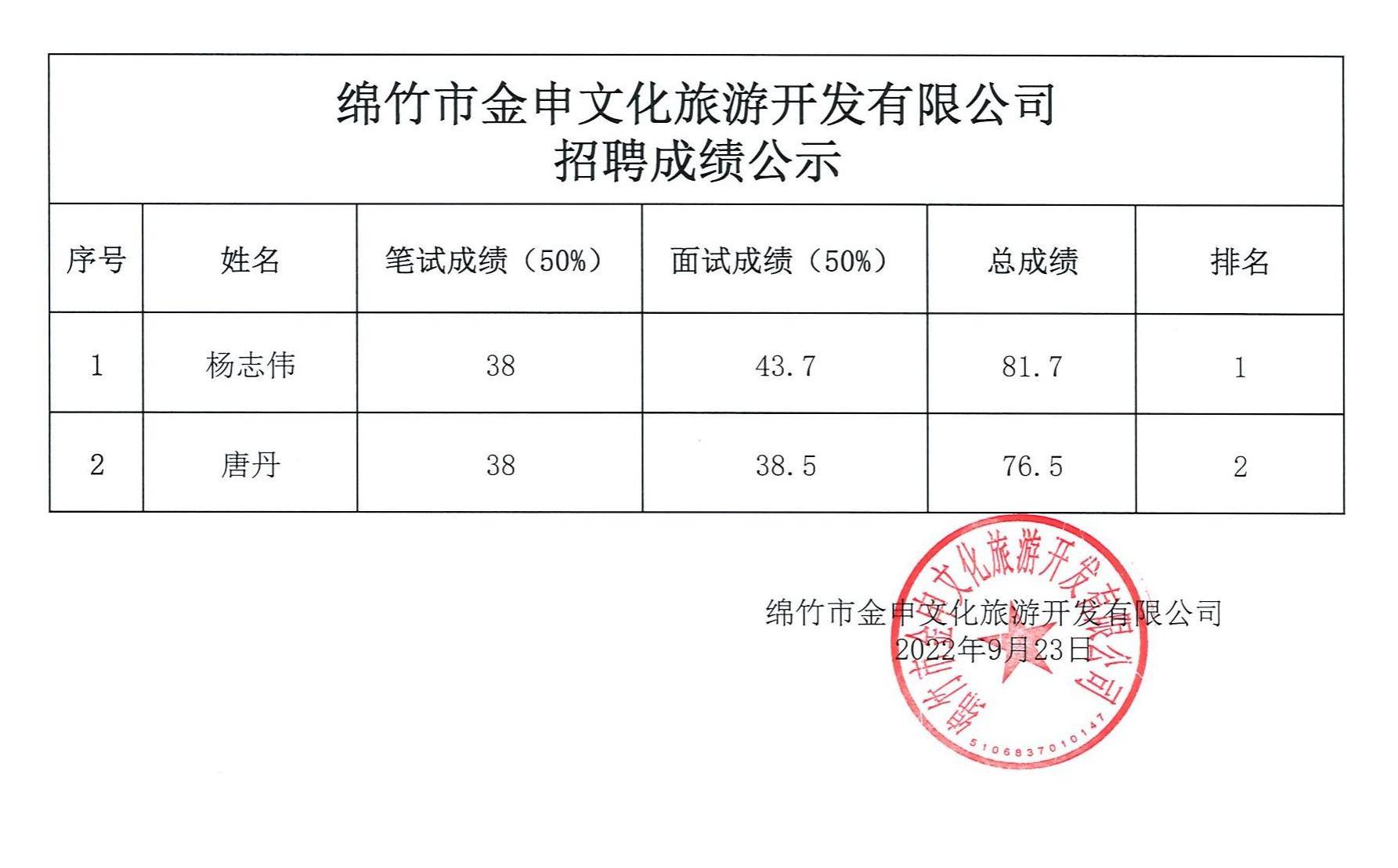 綿竹市金申文化旅游開(kāi)發(fā)有限公司招聘成績(jì)公示