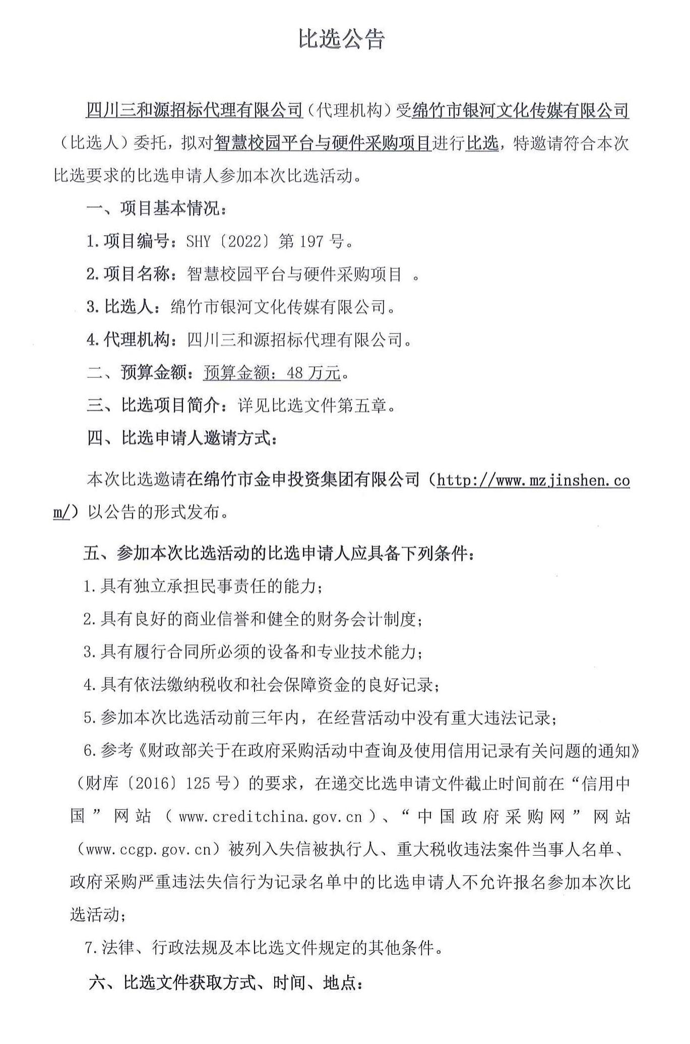 智慧校園平臺與硬件采購項目比選公告