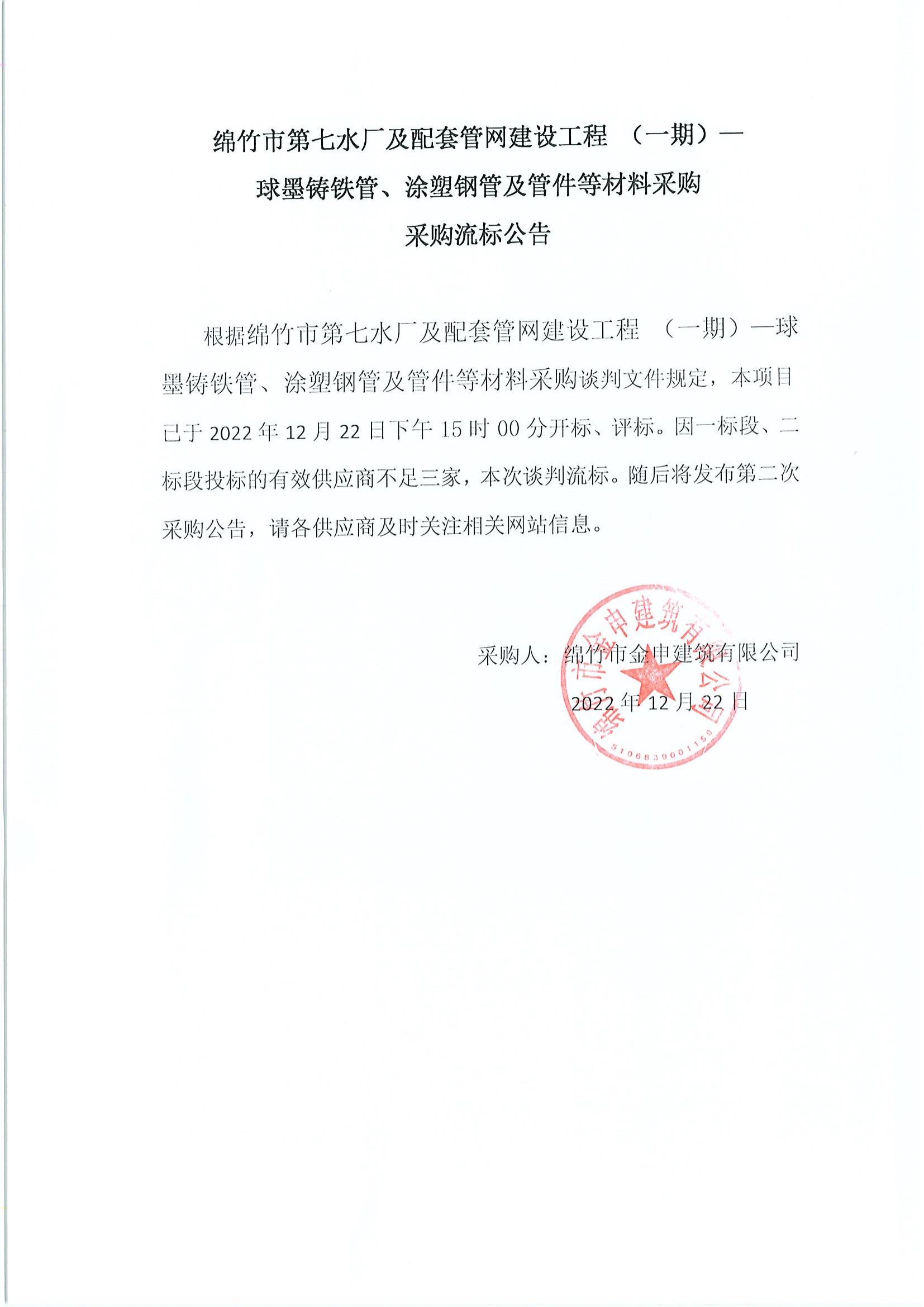 綿竹第七水廠(chǎng)配套管網(wǎng)建設工程(一、二)標段流標公告