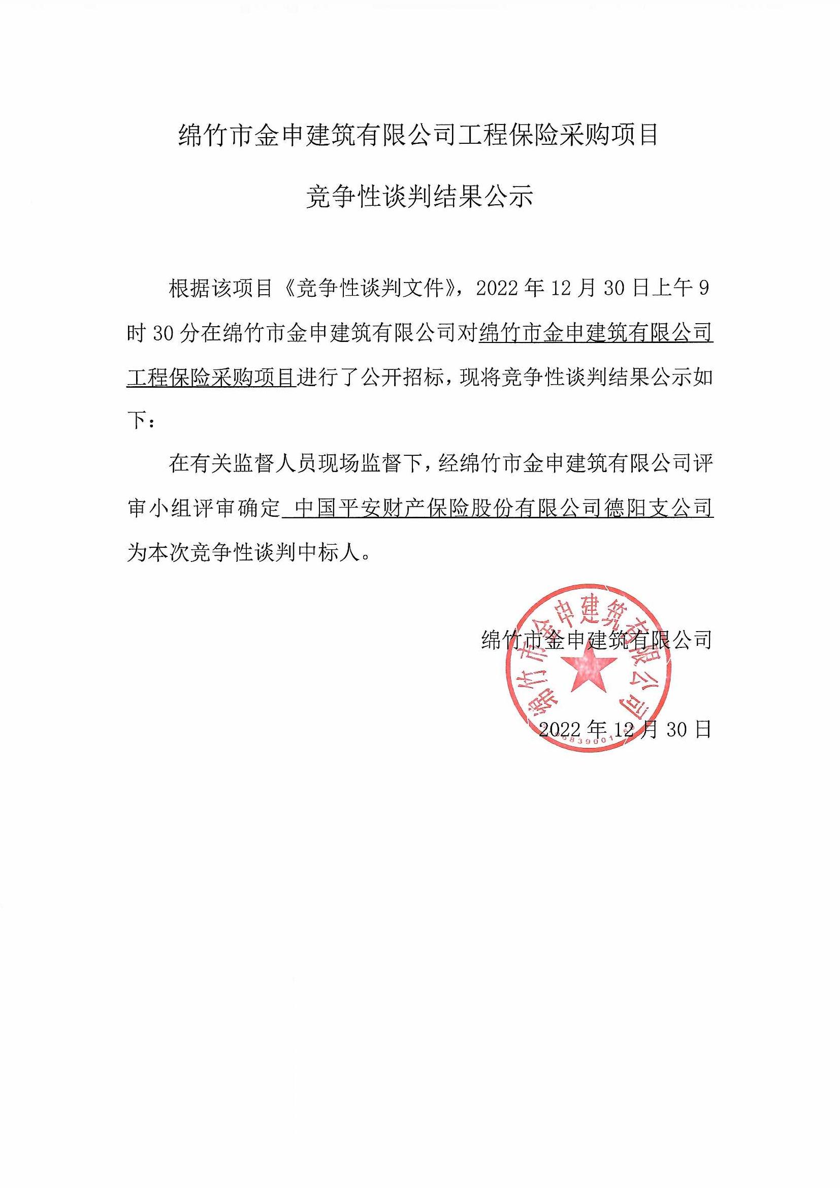 金申建筑有限公司工程保險采購項目競爭性談判結果公示