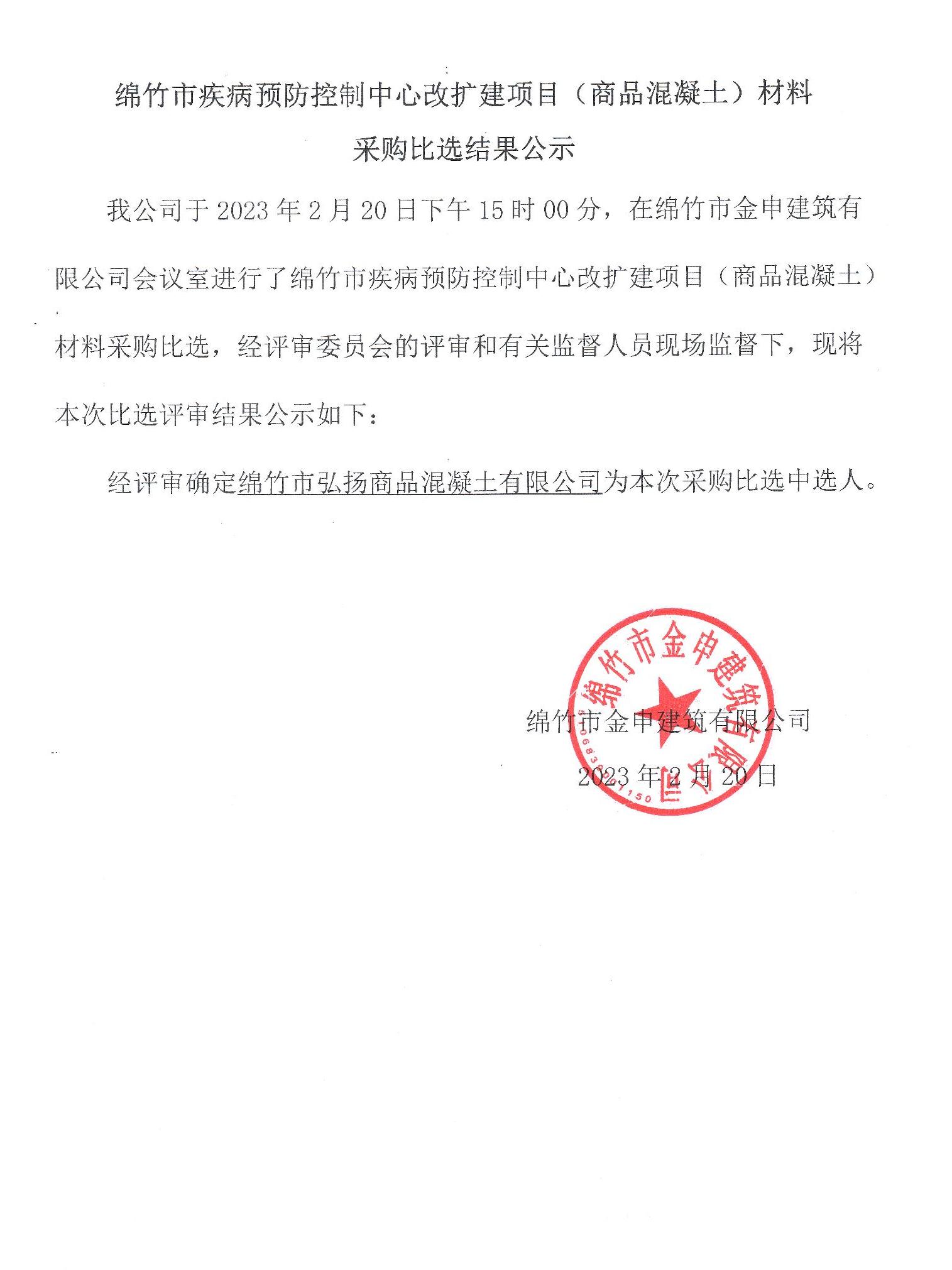 綿竹疾病預防中心改擴建項目(商品混凝土)采購比選結果公示