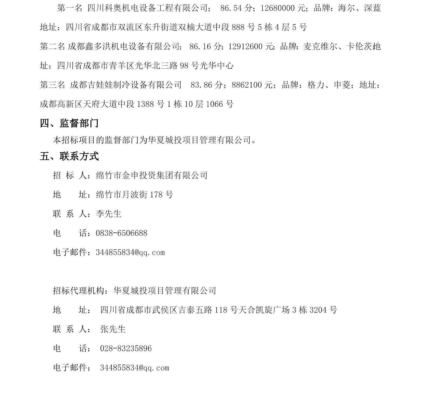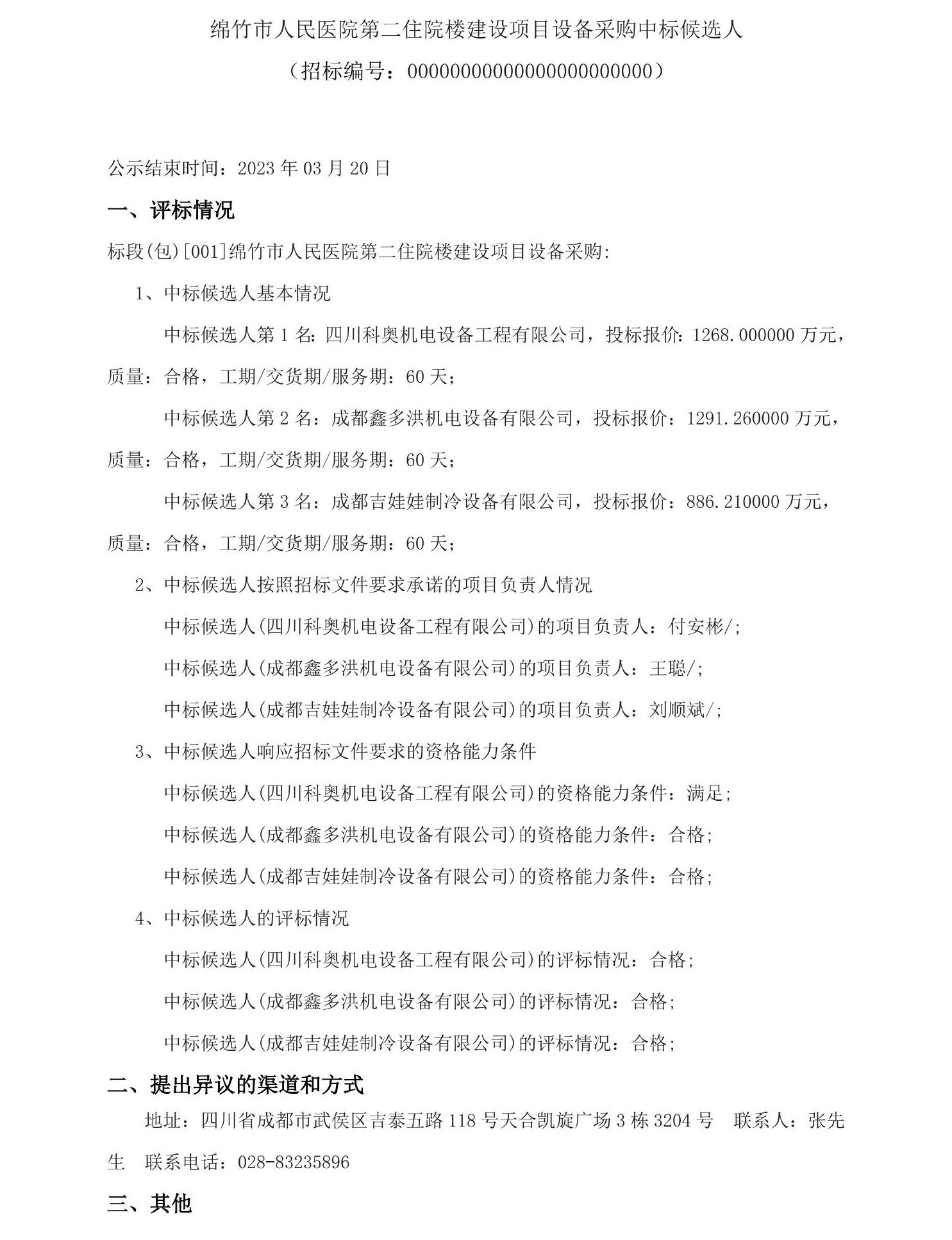 綿竹市人民醫院第二住院樓建設項目設備采購中標候選人