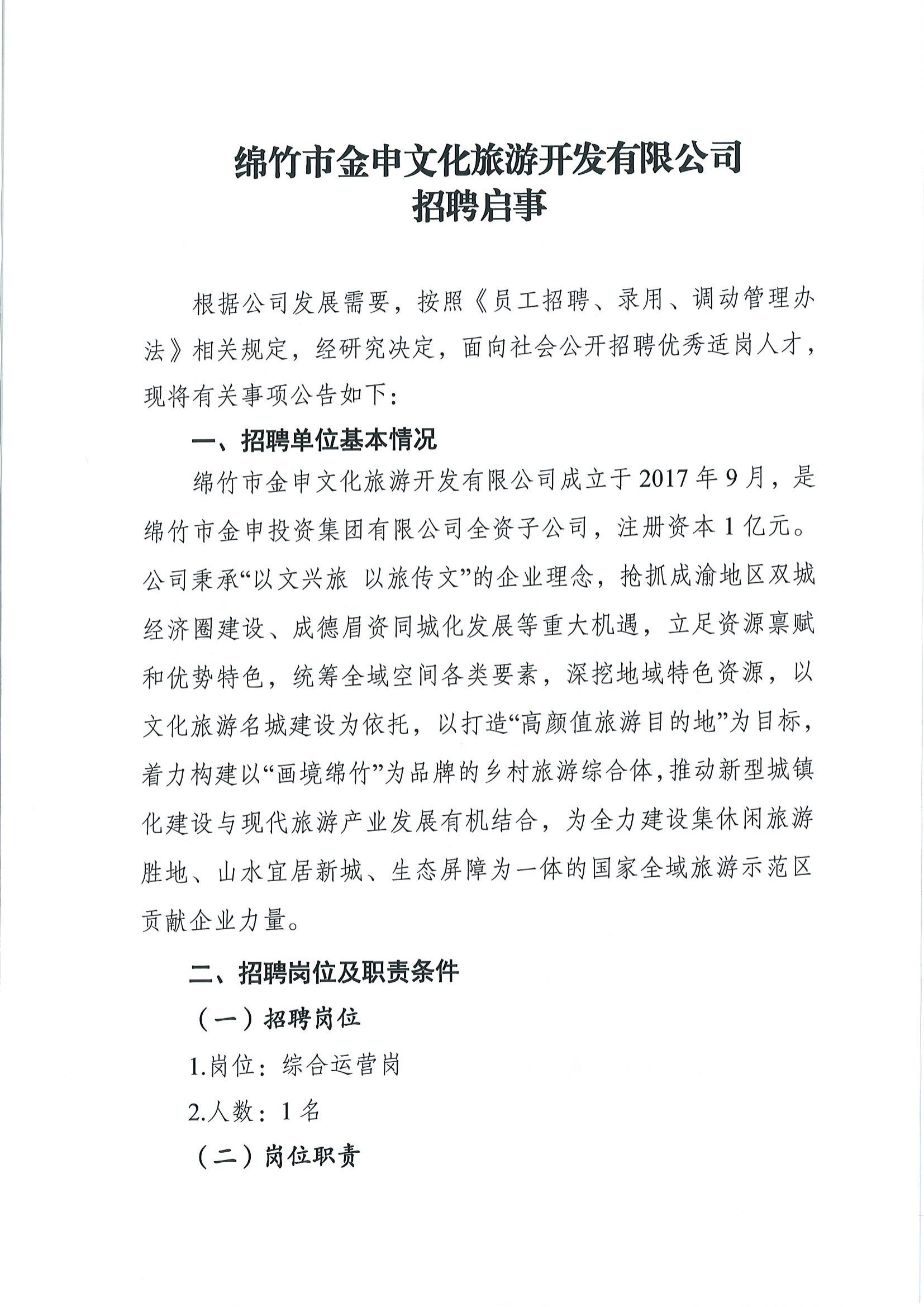 綿竹市金申文化旅游開(kāi)發(fā)有限公司招聘啟事