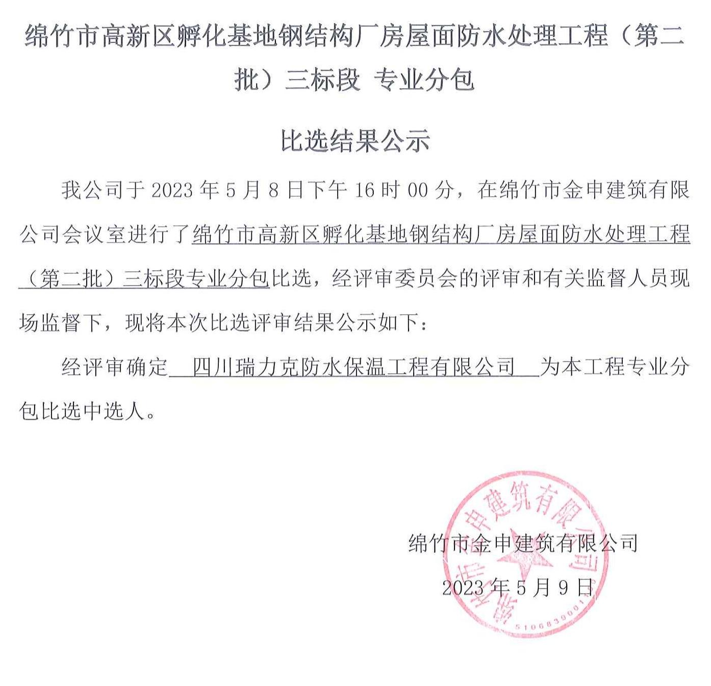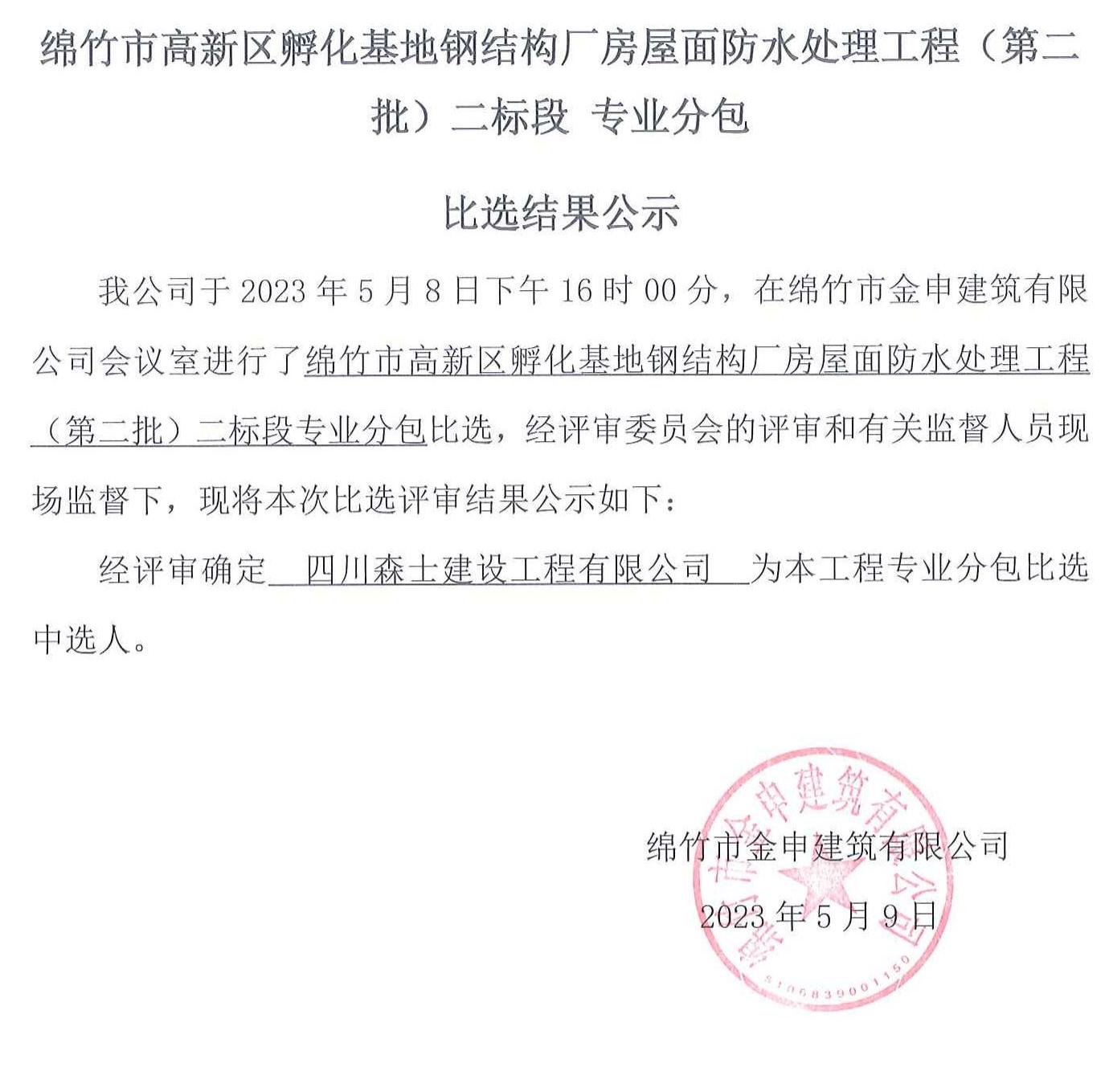 高新區孵化園防水處理工程(第二批)分包比選結果公示