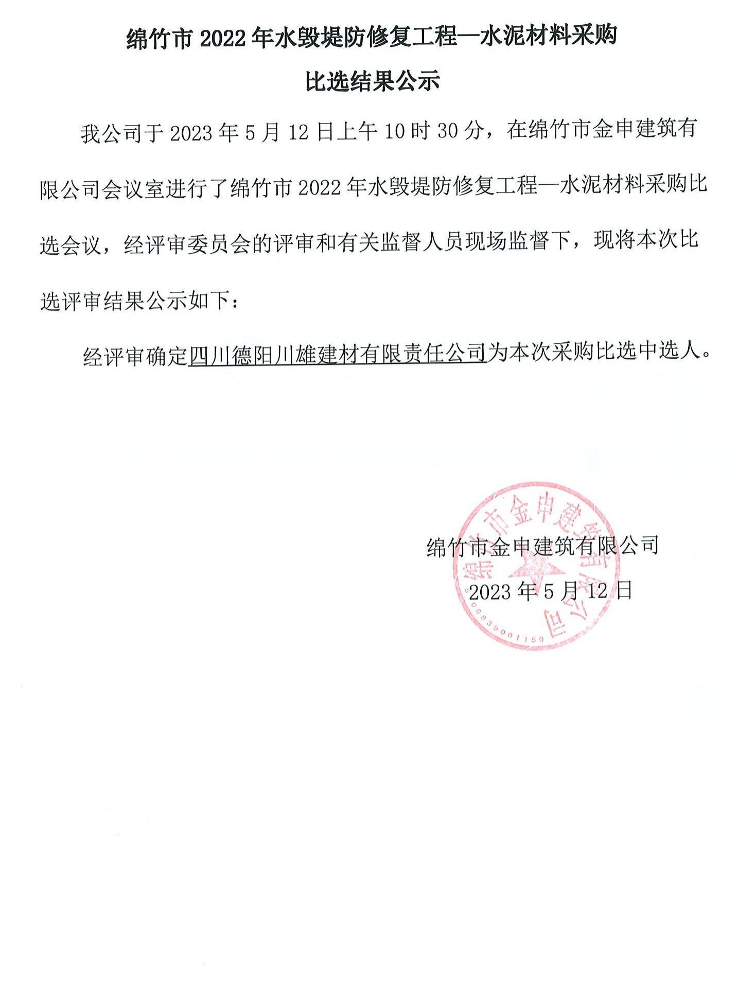 綿竹市2022年水毀堤防修復工程-水泥材料采購比選結果公告