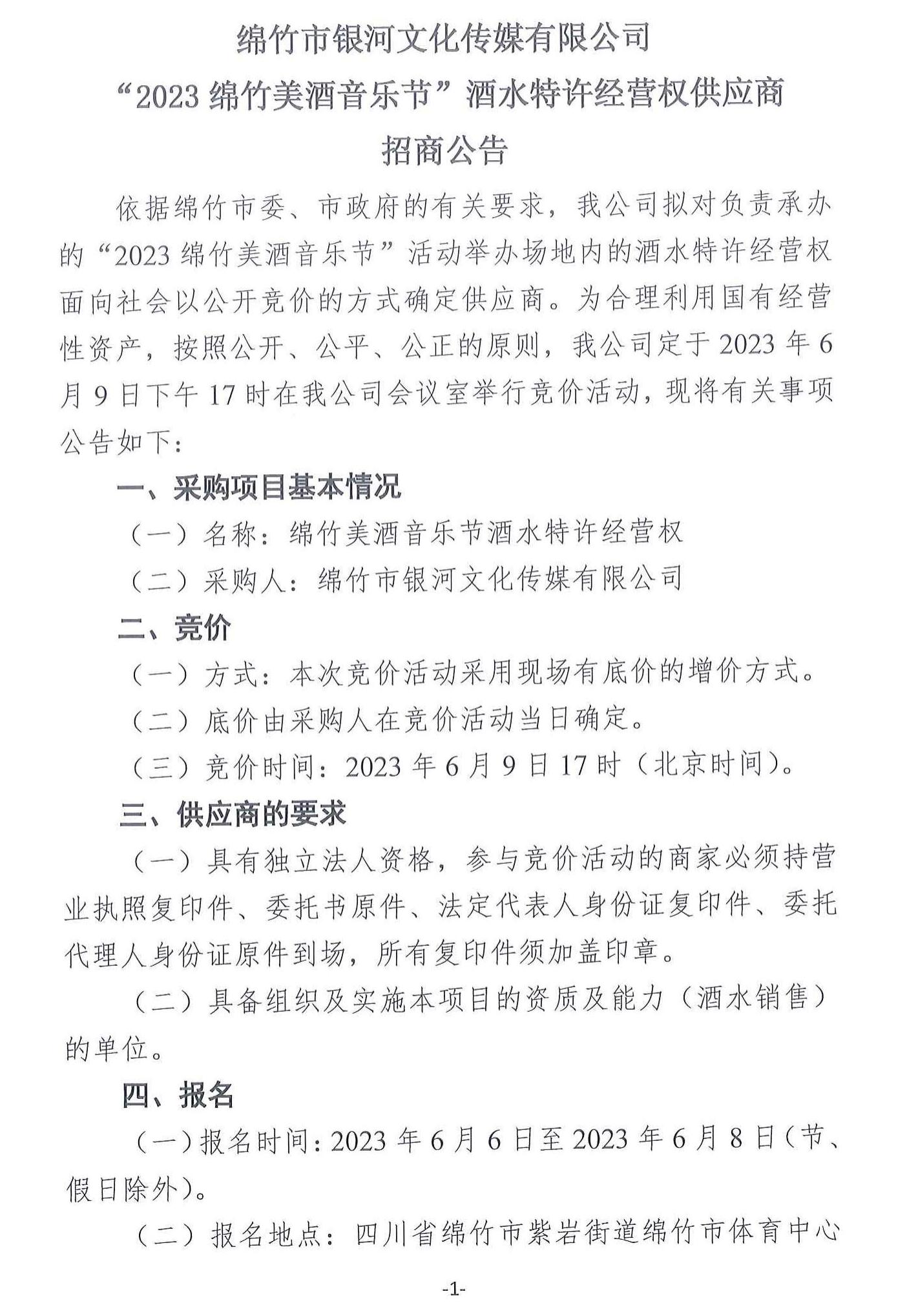 “2023綿竹美酒音樂(lè )節”酒水特許經(jīng)營(yíng)權供應商招商公告