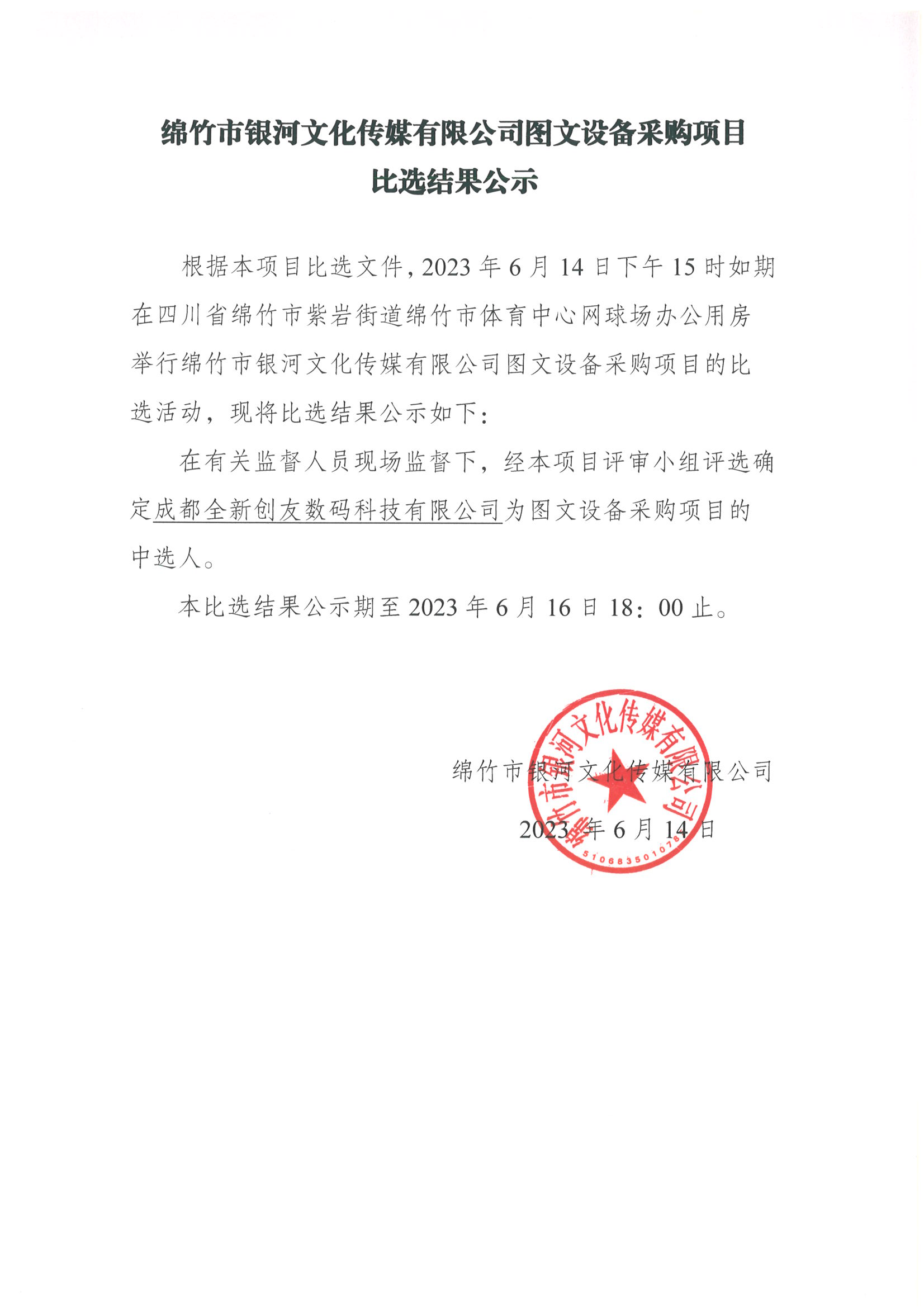 銀河文化傳媒有限公司圖文設備采購項目比選結果公示