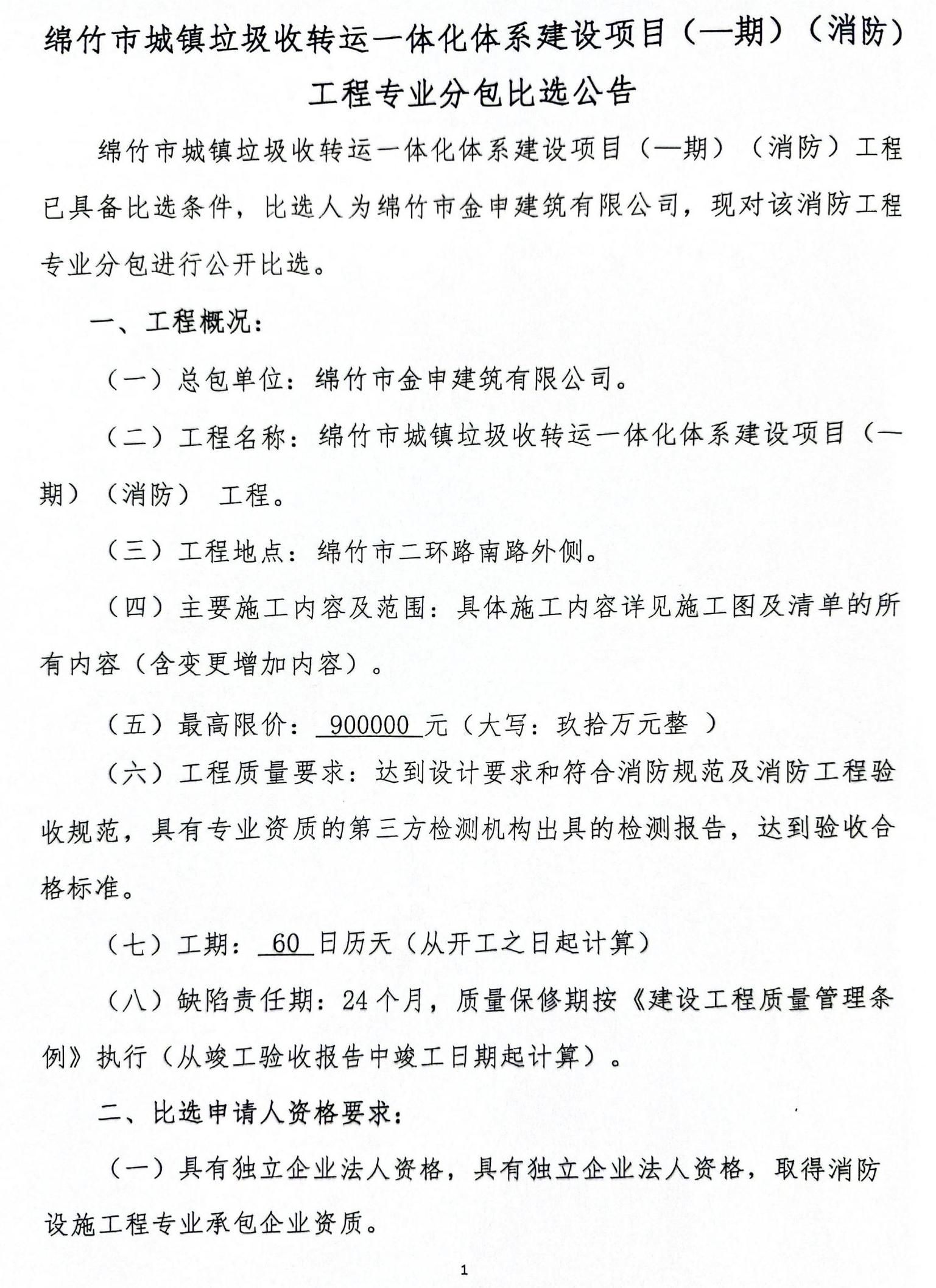 垃圾收轉運一體化體系項目(一期)(消防)分包比選公告