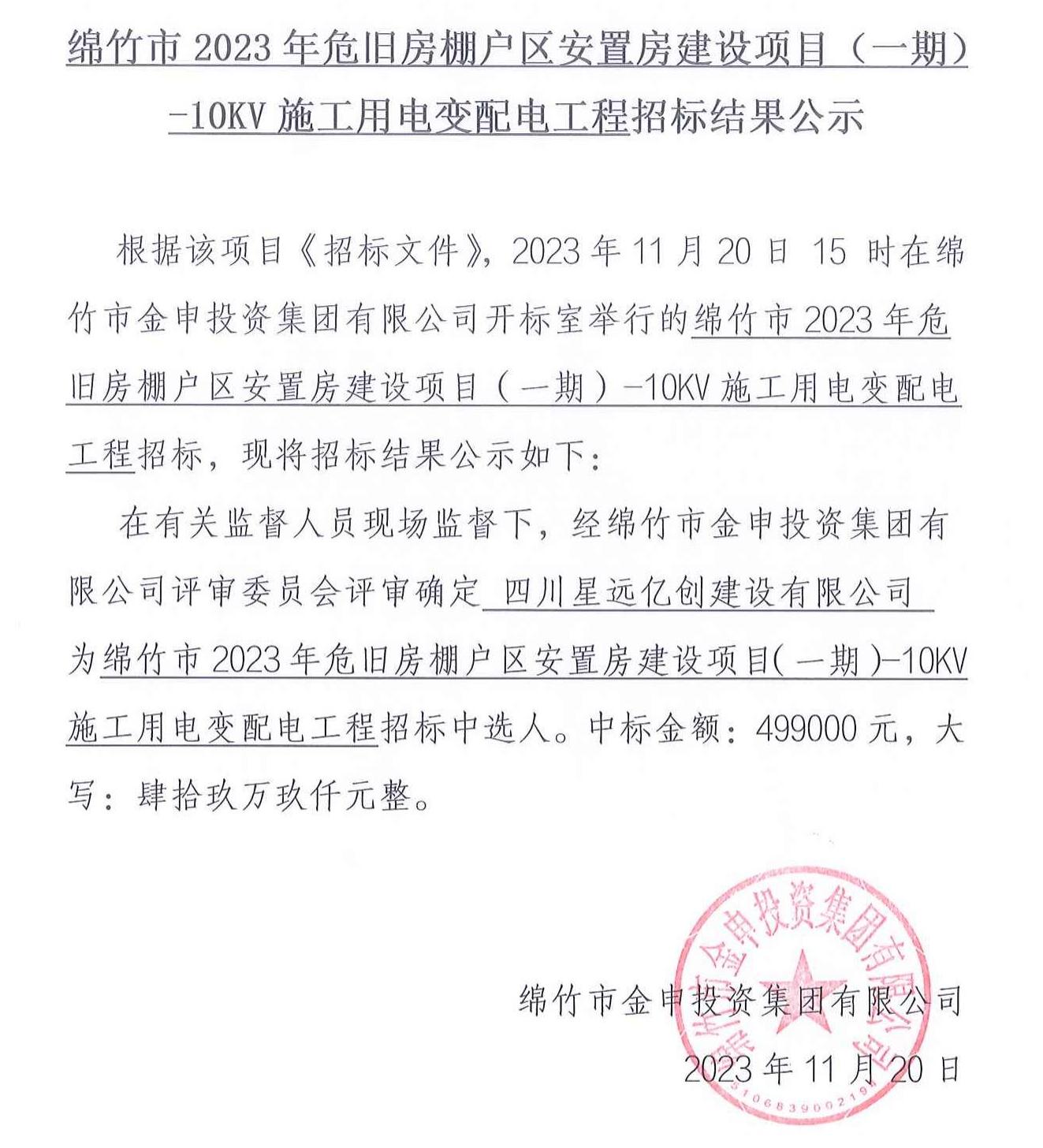 綿竹2023年危舊房棚戶(hù)區安置房(一期)變配電招標結果公示