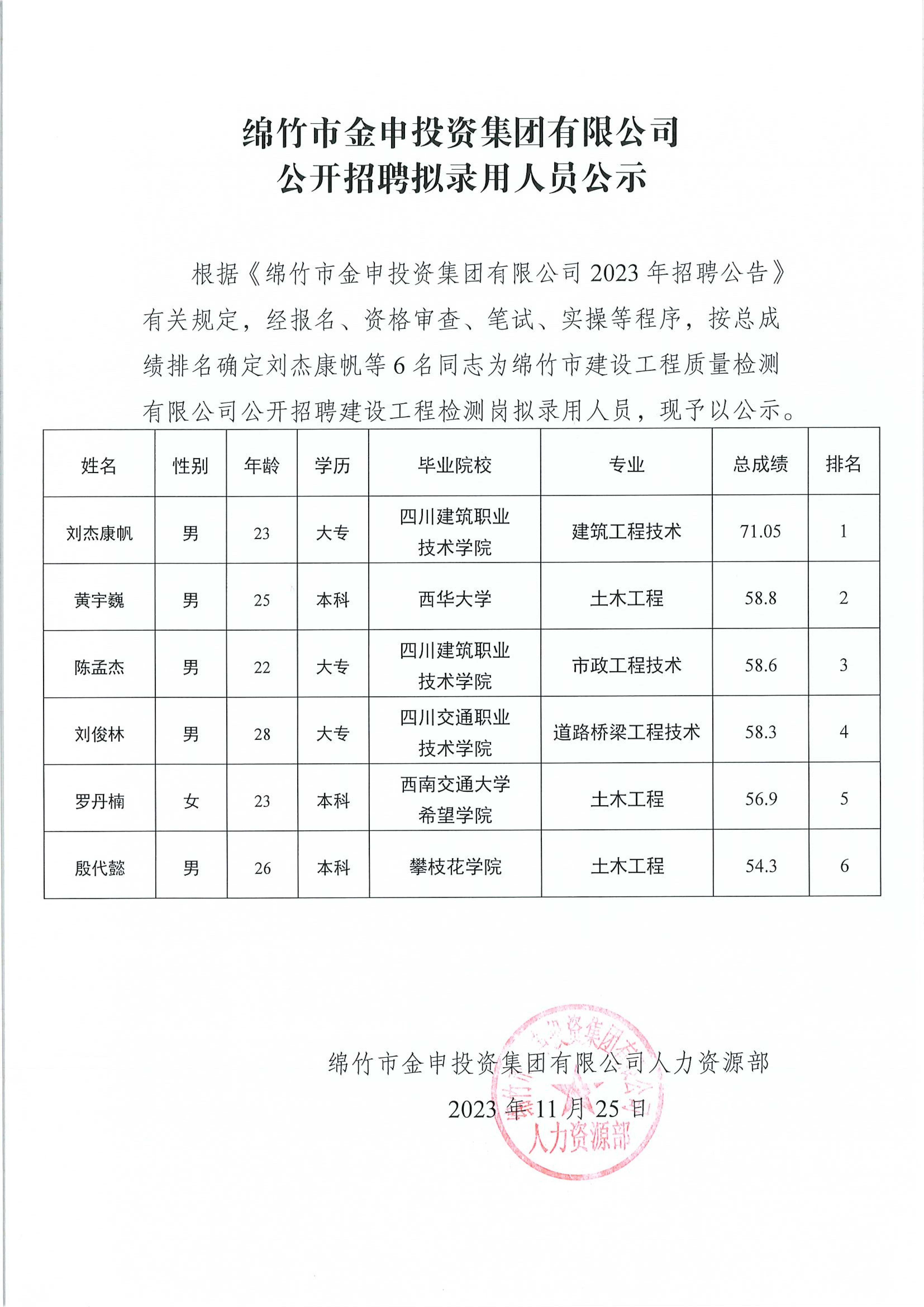 綿竹市金申投資集團有限公司公開(kāi)招聘擬錄用人員公示