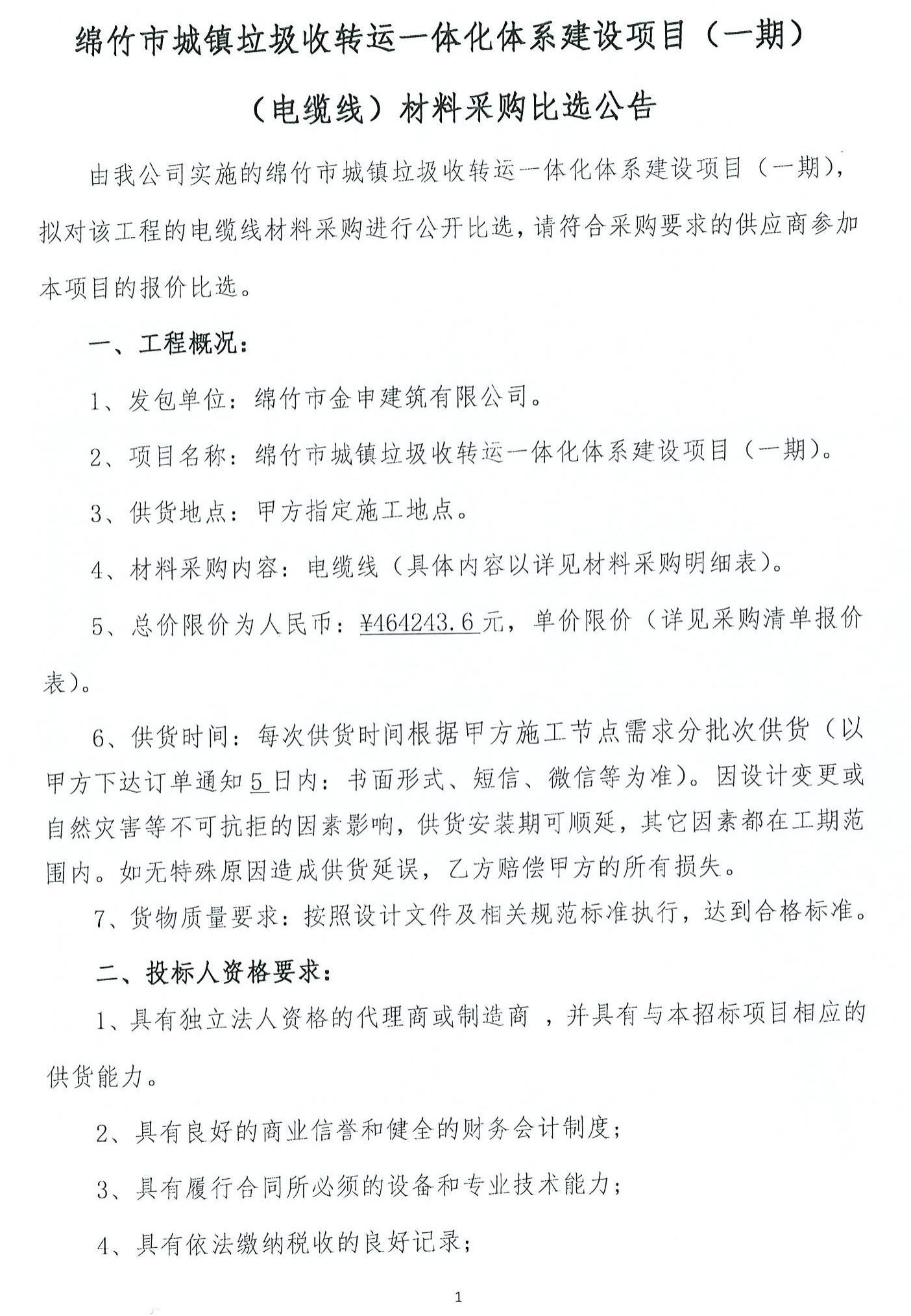 城鎮垃圾收轉運一體化建設項目(一期)電纜線(xiàn)招標公告
