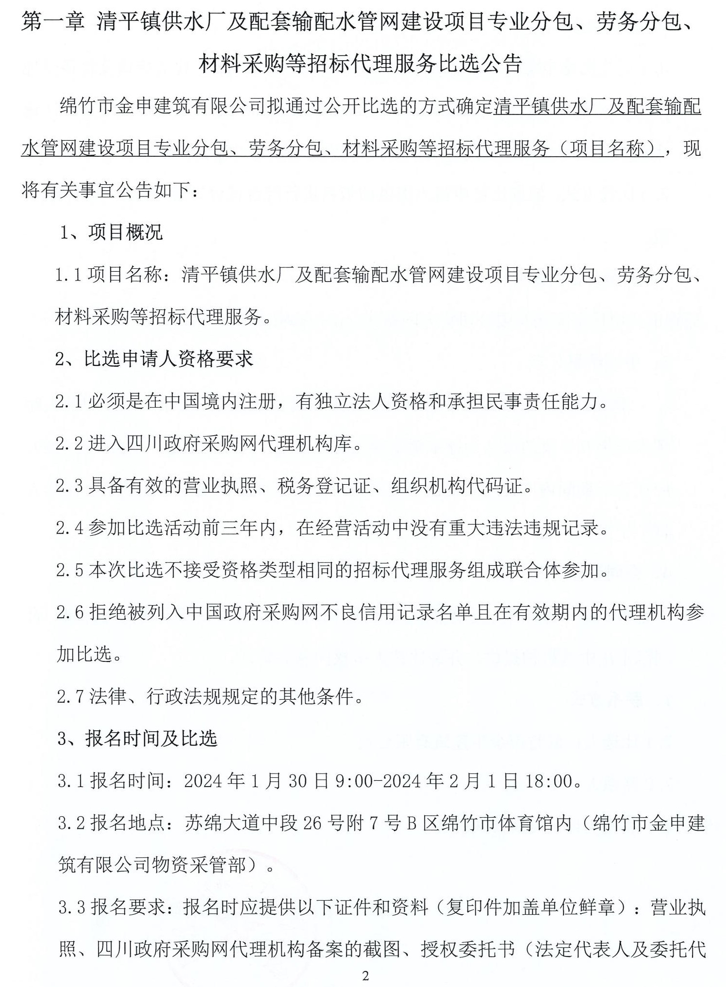 清平鎮供水廠(chǎng)及配套輸配水管網(wǎng)建設分包項目招標比選公告