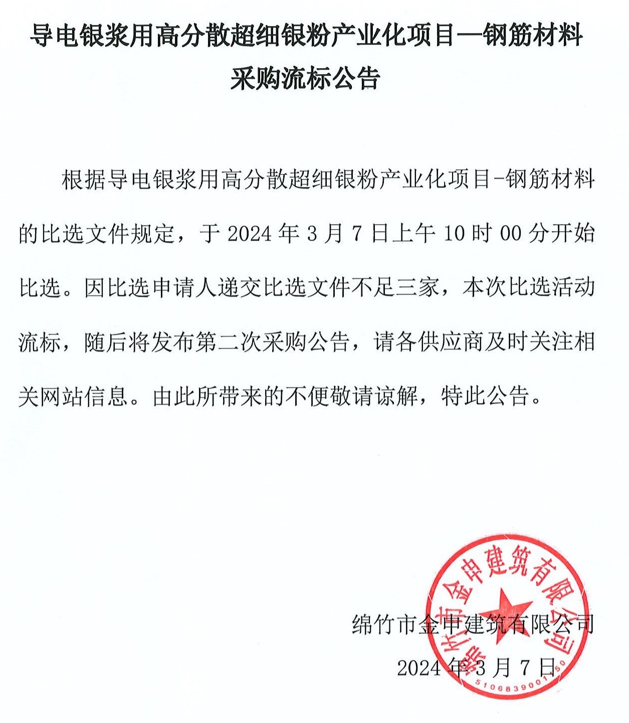 導電銀漿用高分散超細銀粉項目鋼筋材料采購流標公告