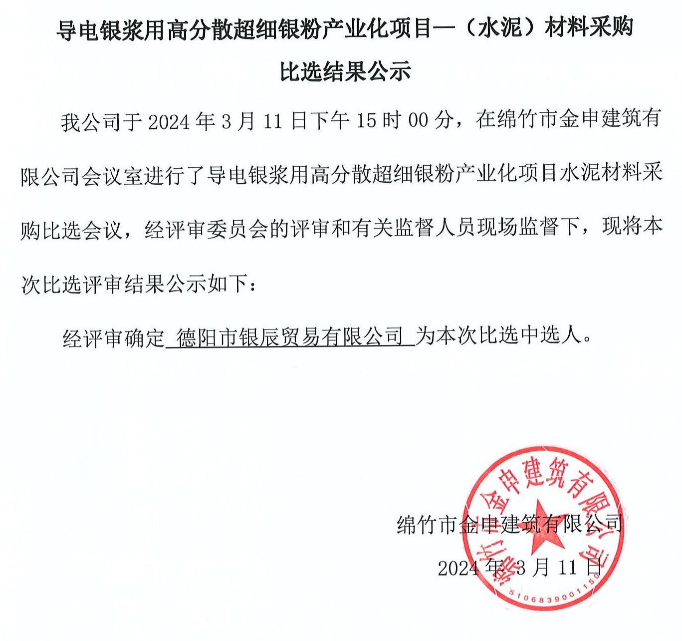 導電銀漿用高分散超細銀粉產(chǎn)業(yè)項目(水泥)采購結果公示
