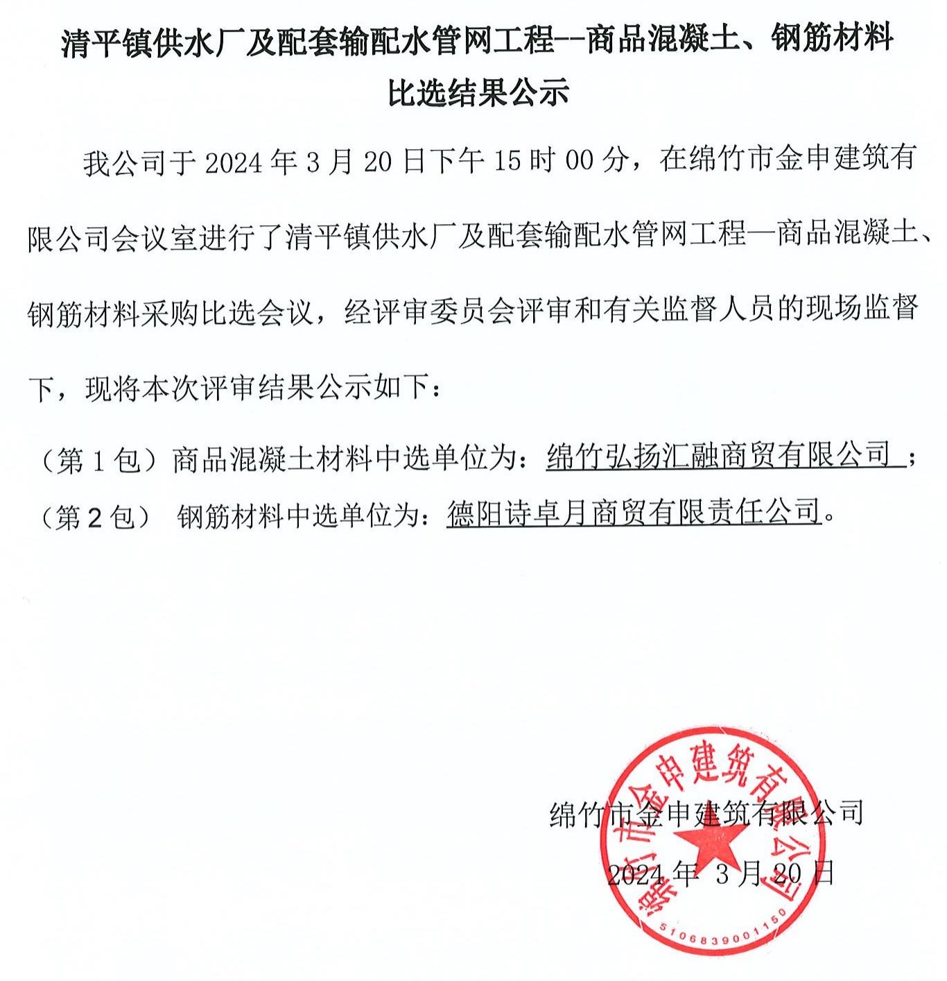 清平鎮供水廠(chǎng)及配套輸配水管網(wǎng)商品混凝土、鋼筋結果公示