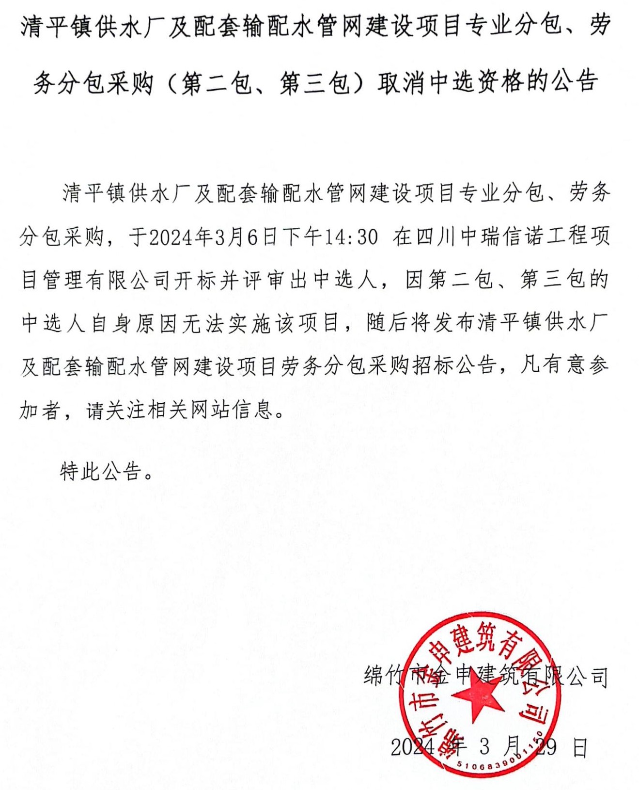 清平供水廠(chǎng)管網(wǎng)建設項目勞務(wù)分包取消中選資格公示