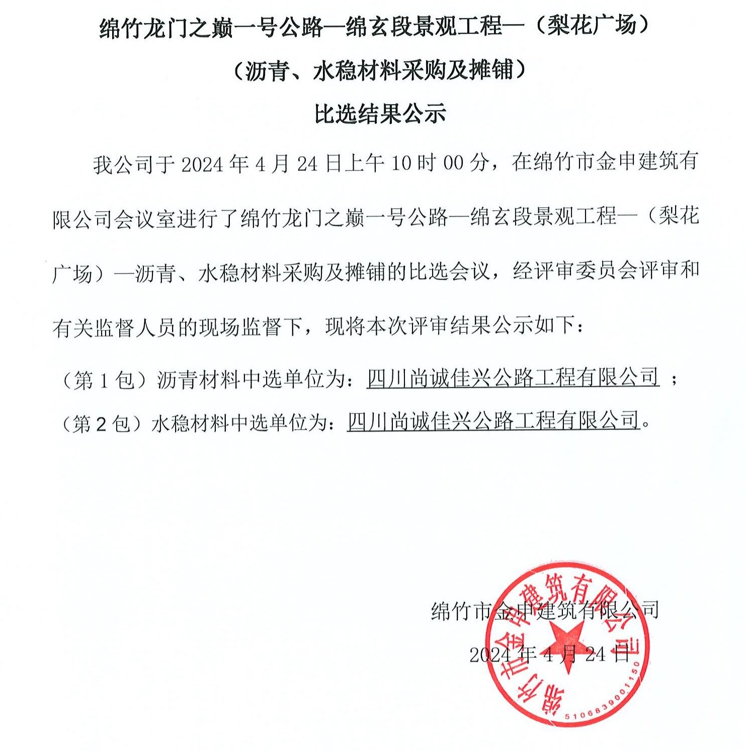 龍門(mén)之巔一號公路綿玄段(梨花廣場(chǎng))瀝青、水穩結果公示