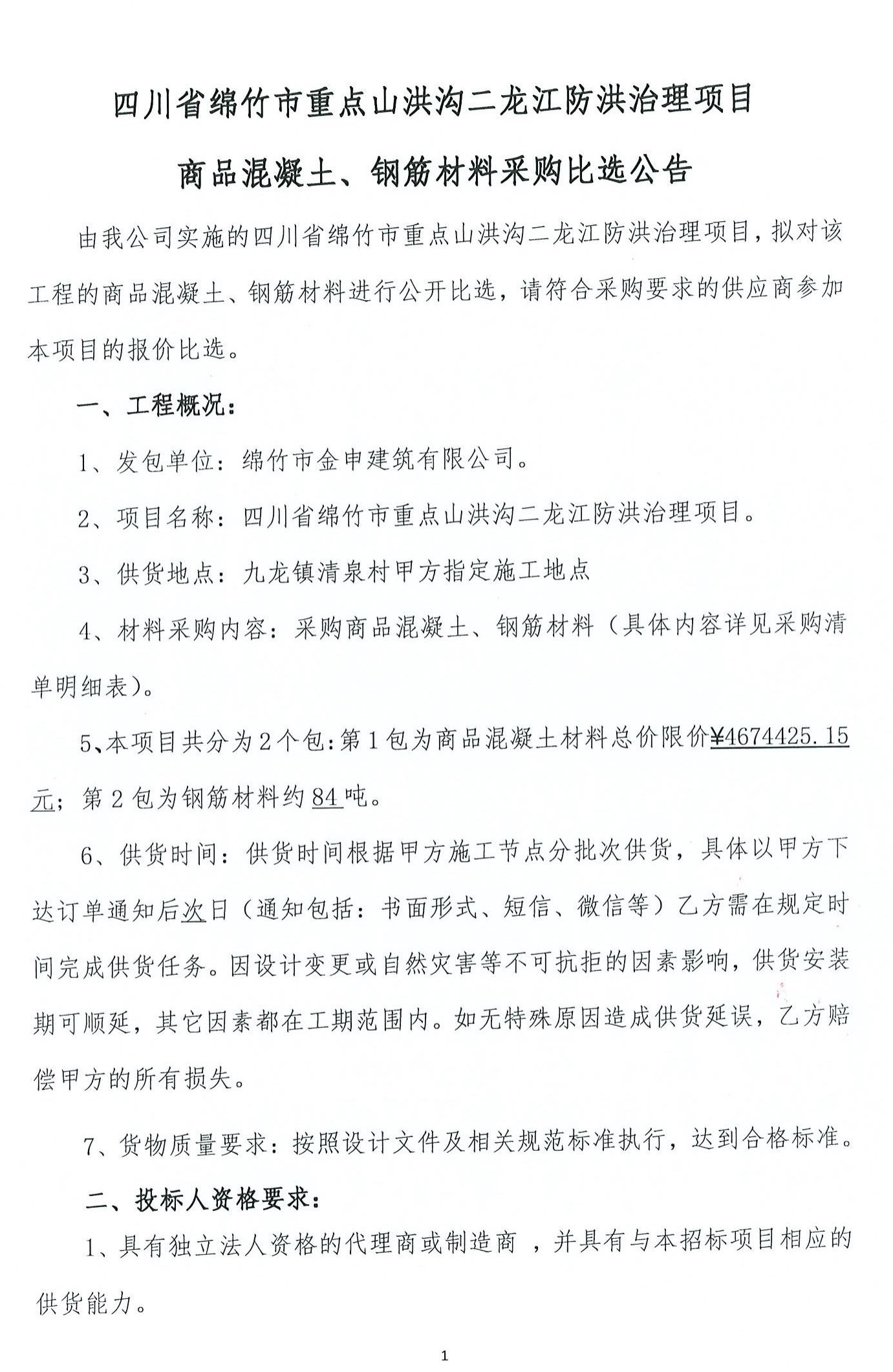 二龍江防洪治理項目 商品混凝土、鋼筋材料采購比選公告