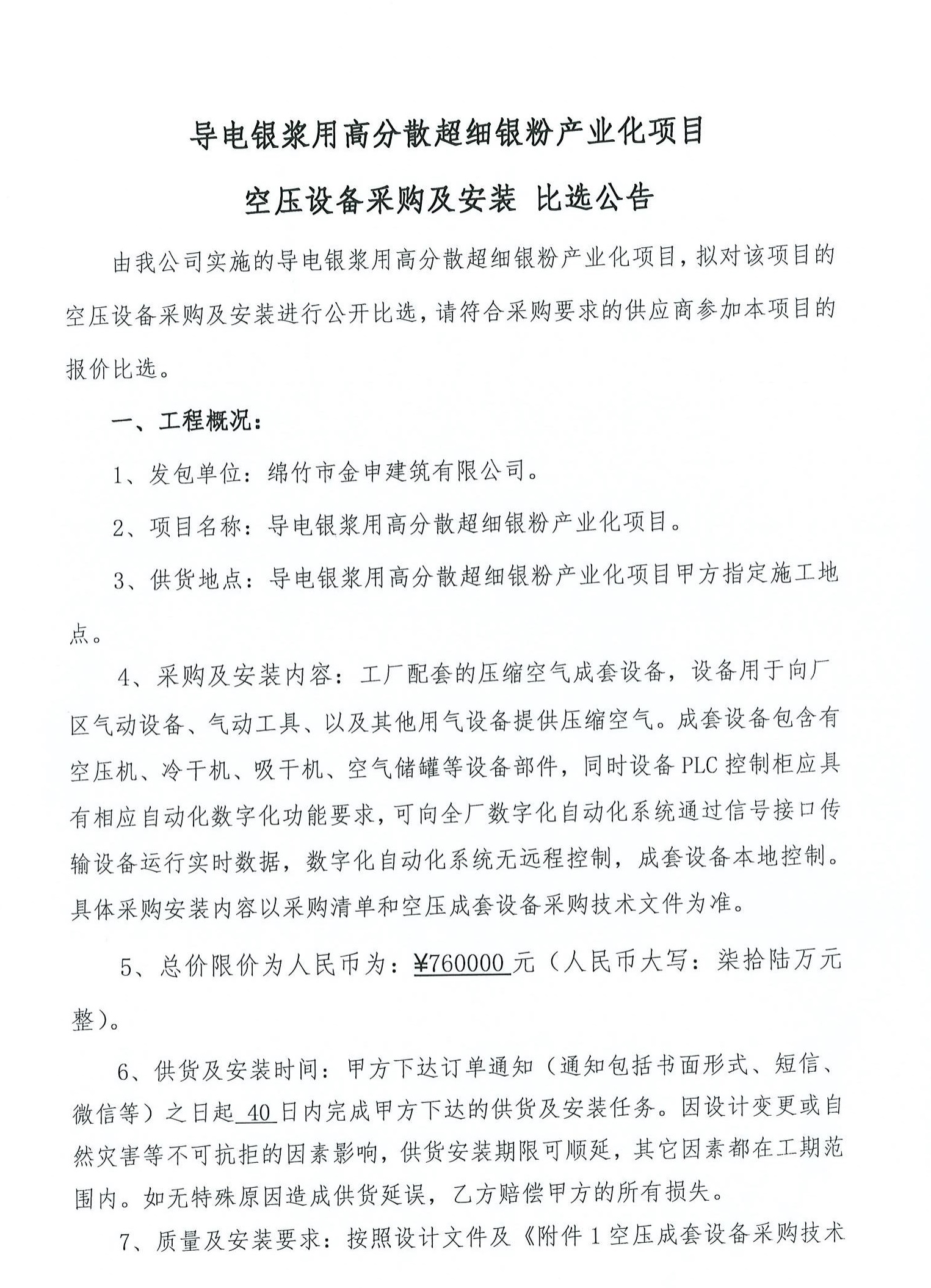 導電銀漿用高分散超細銀粉產(chǎn)業(yè)化項目 空壓設備 比選公告