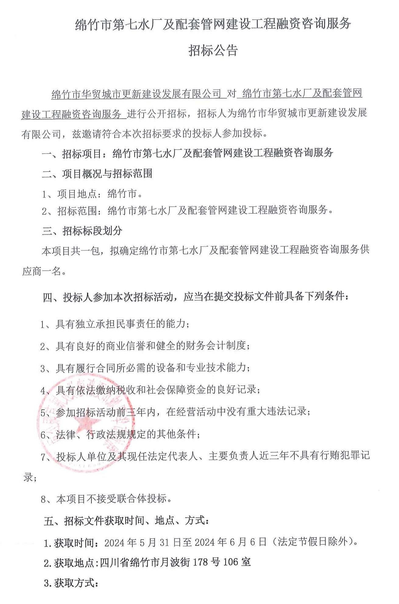 綿竹市第七水廠(chǎng)及配套管網(wǎng)建設工程融資咨詢(xún)服務(wù)招標公告