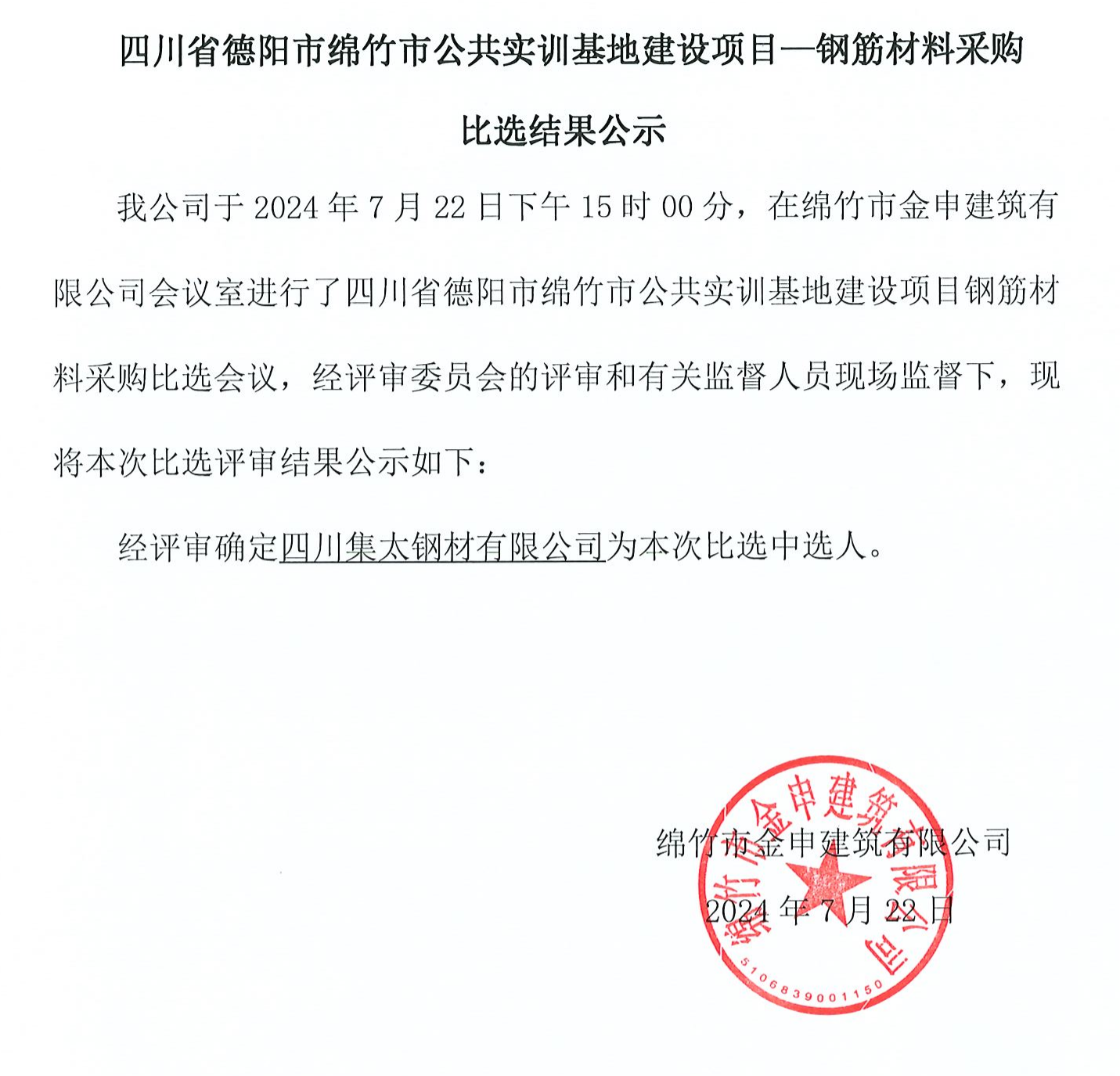 公共實(shí)訓基地建設項目-鋼筋材料采購比選結果公示