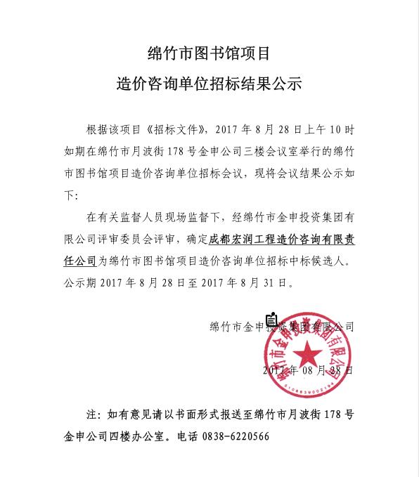 綿竹市圖書(shū)館項目造價(jià)咨詢(xún)單位招標結果公示
