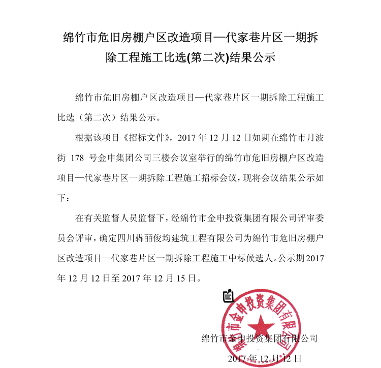 代家巷片區一期拆除工程施工比選(第二次)結果公示