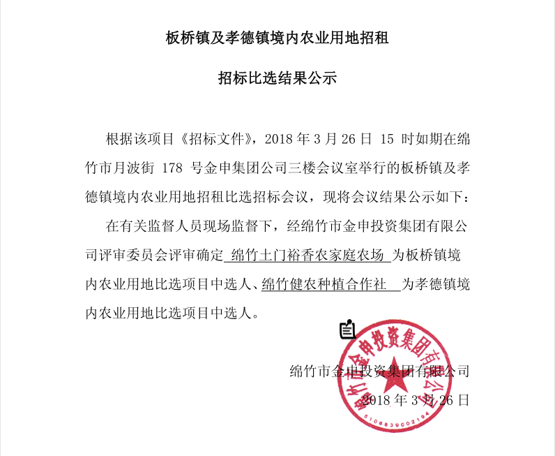 板橋鎮及孝德鎮境內農業(yè)用地招租招標比選結果公示