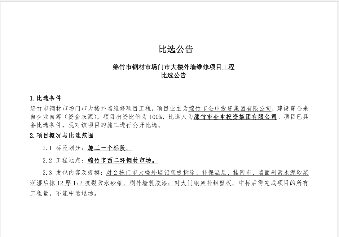 鋼材市場(chǎng)門(mén)市大樓外墻維修項目比選公告