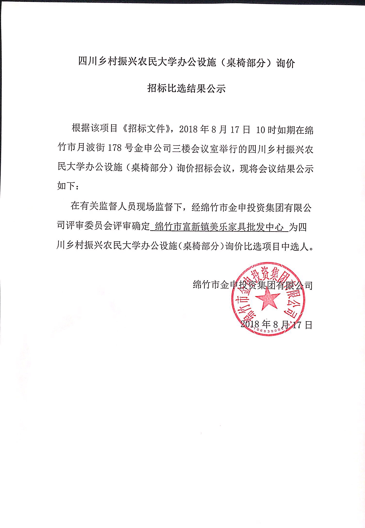 農民大學(xué)(桌椅部分)詢(xún)價(jià)招標比選結果公示