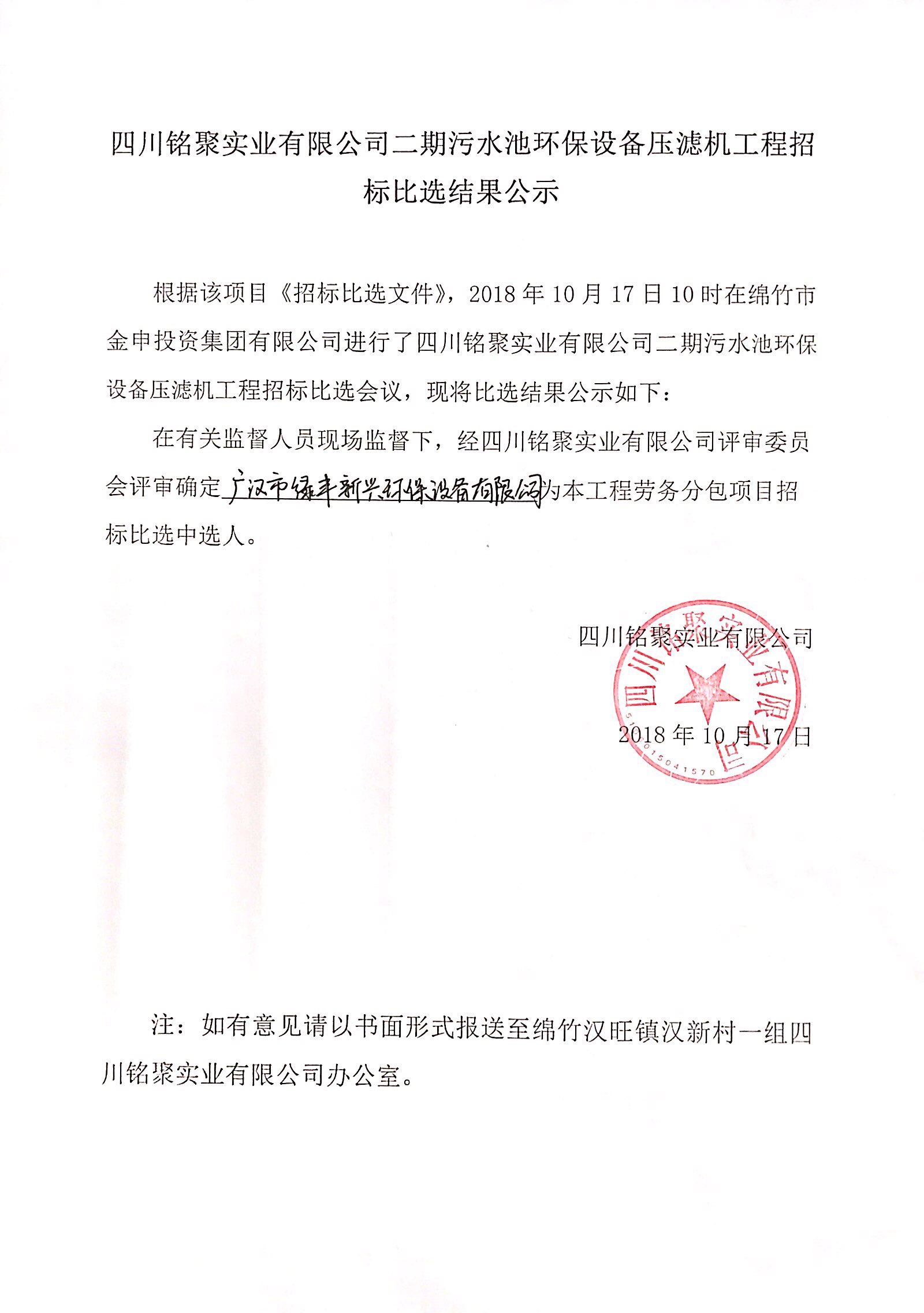 銘聚公司二期污水池環(huán)保設備壓濾機工程招標比選結果公示