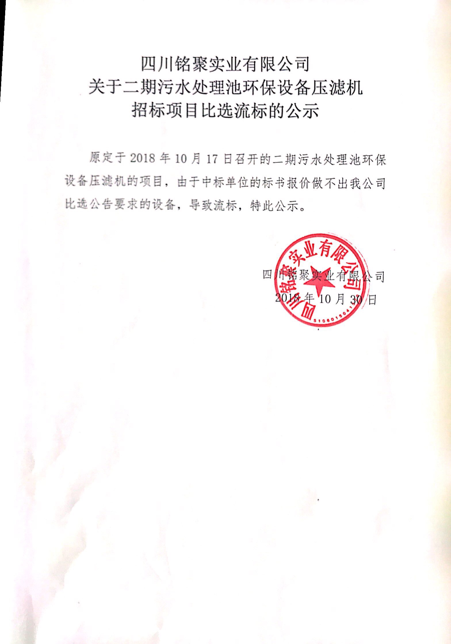 銘聚公司二期污水處理池環(huán)保設備壓濾機招標比選流標公示