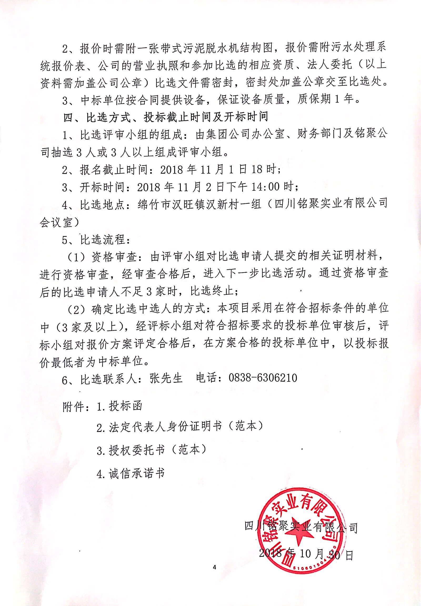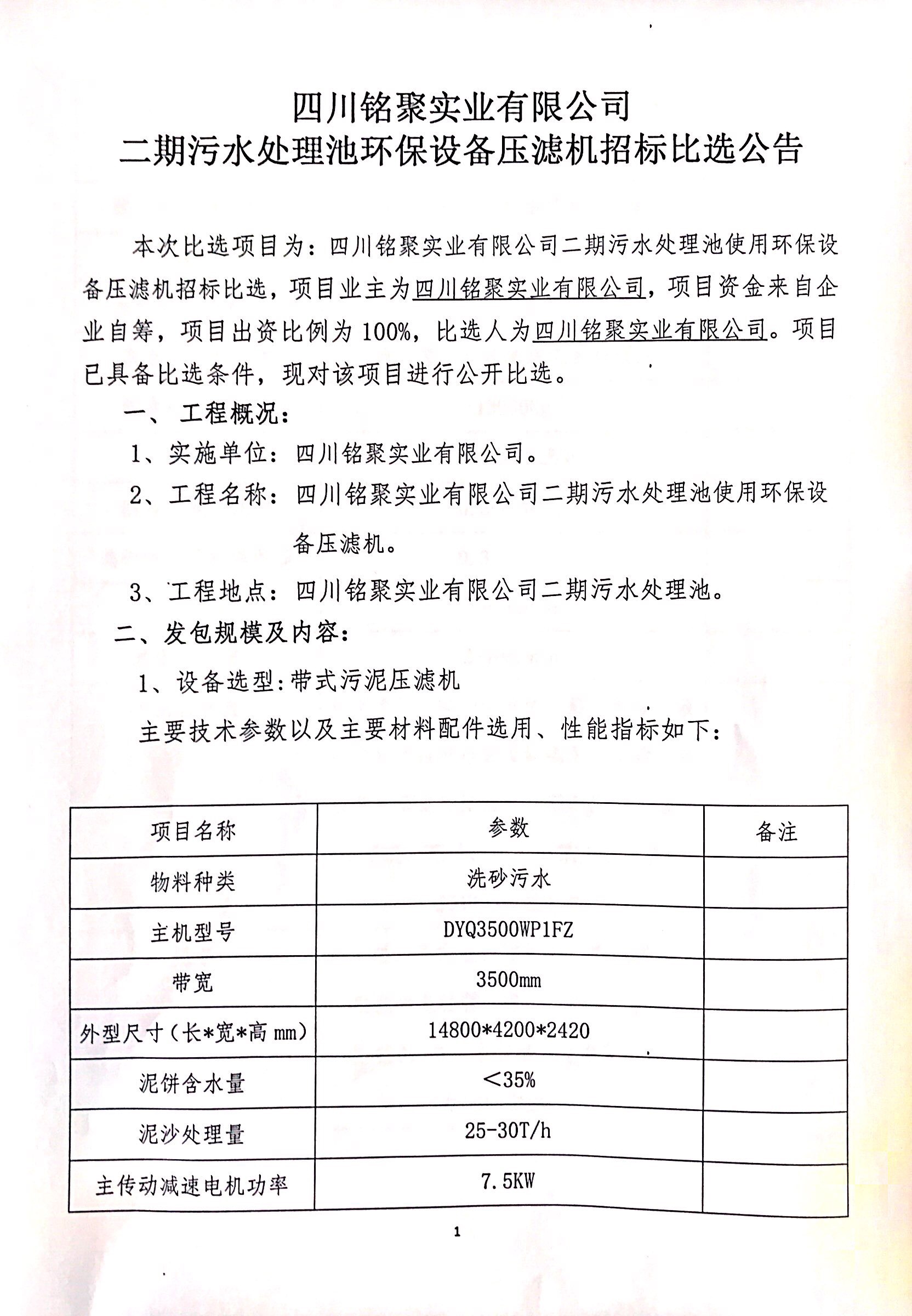 銘聚公司二期污水處理池壓濾機招標比選公告(第二次)