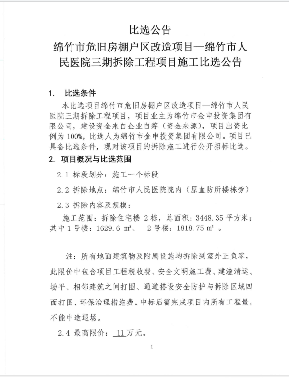 綿竹市人民醫院三期拆除工程項目施工比選公告