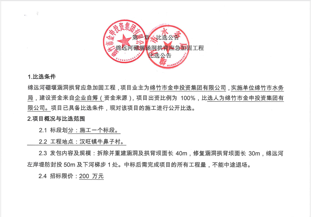 綿遠河硼堰涵洞拱背應急加固工程比選公告