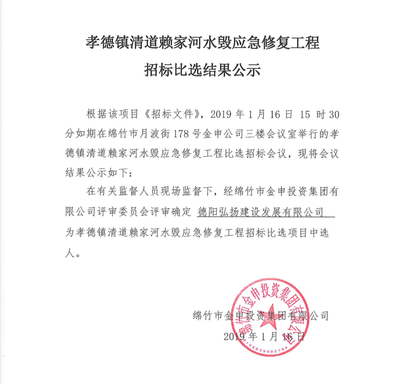 孝德鎮清道賴(lài)家河水毀應急修復工程比選結果公示