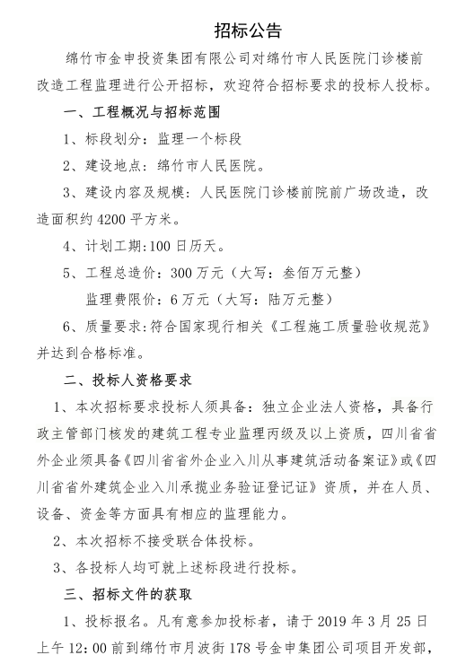 關(guān)于對綿竹市人民醫院改造工程監理的招標公告
