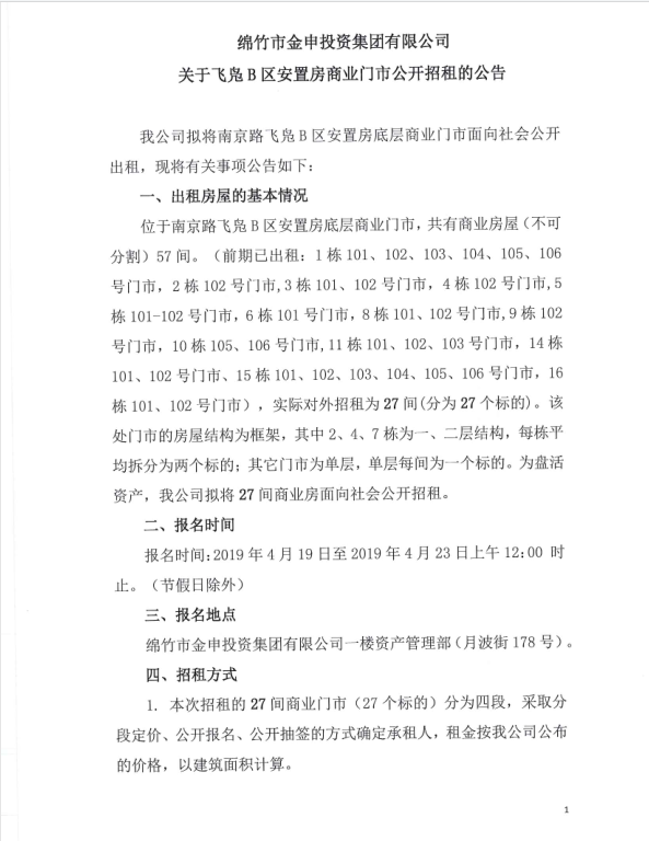 飛鳧B區安置房商業(yè)門(mén)市第四次公開(kāi)招租公告