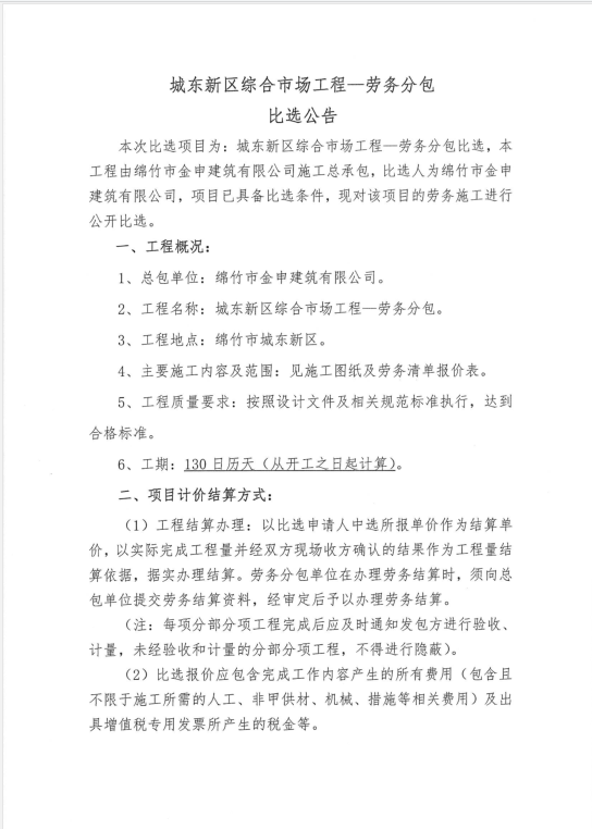 城東新區綜合市場(chǎng)工程——勞務(wù)分包比選公告
