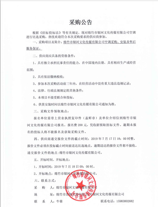 銀河文化傳媒公司空調采購招標比選公告