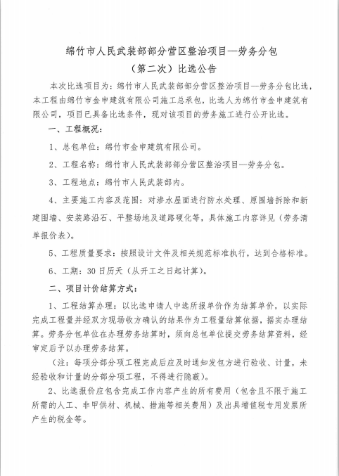 市武裝部部分營(yíng)區整治項目—勞務(wù)分包(第二次)比選公告