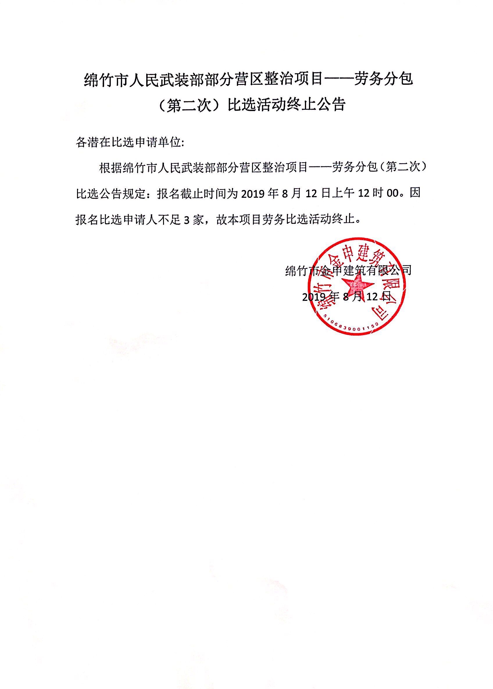 市武裝部整治項目—勞務(wù)分包(第二次)比選活動(dòng)終止公告