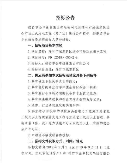 市城東綜合市場(chǎng)正式用電工程(第二次)公開(kāi)招標公告