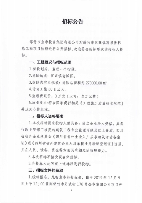 綿竹市漢旺鎮震損房拆除工程項目監理招標比選公告