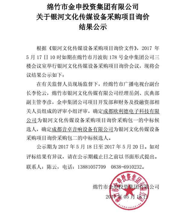 銀河文化傳媒設備采購項目詢(xún)價(jià)結果公示