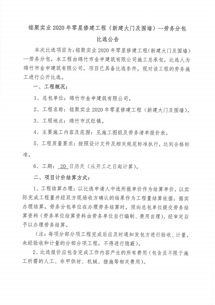 銘聚實(shí)業(yè)2020年零星修建工程勞務(wù)分包比選公告