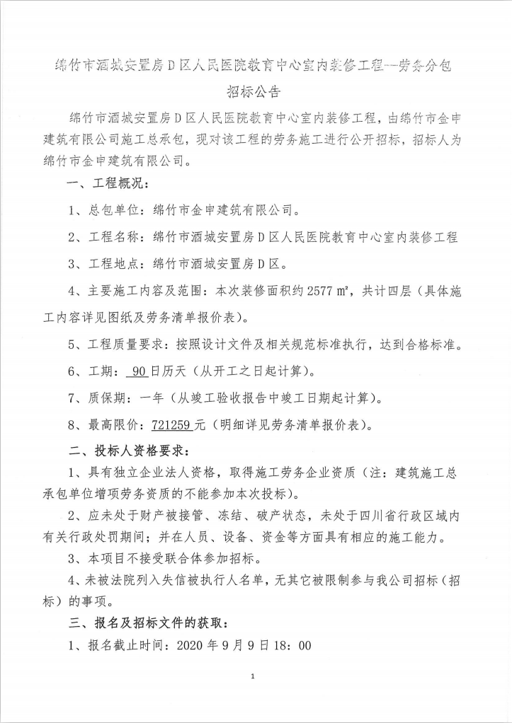 人民醫院教育中心室內裝修工程-勞務(wù)分包招標公告