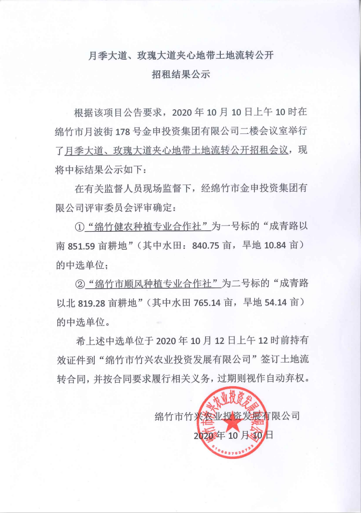 月季大道、玫瑰大道夾心地帶土地流轉公開(kāi)招租結果公示