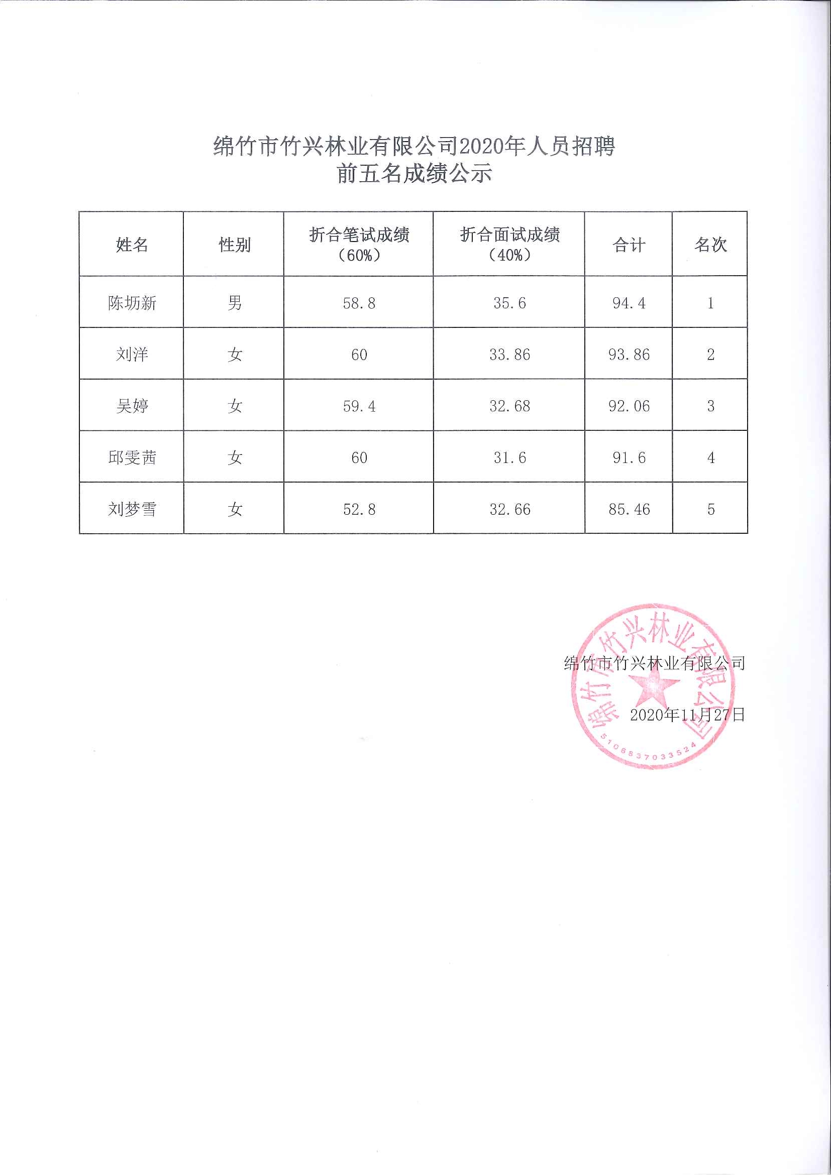 綿竹市竹興林業(yè)有限公司2020年人員招聘前五名成績(jì)公示